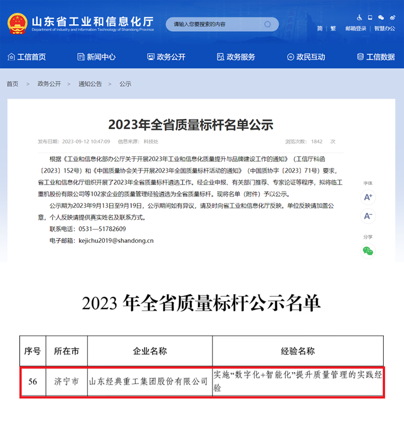 日前,山東省工業和信息化廳組織開展的“2023年全省質量標桿”遴選結果正式公布。其中,經典重工集團股份有限公司的“實施‘數字化+智能化’提升質量管理的實踐經驗”獲評全省質量標桿。