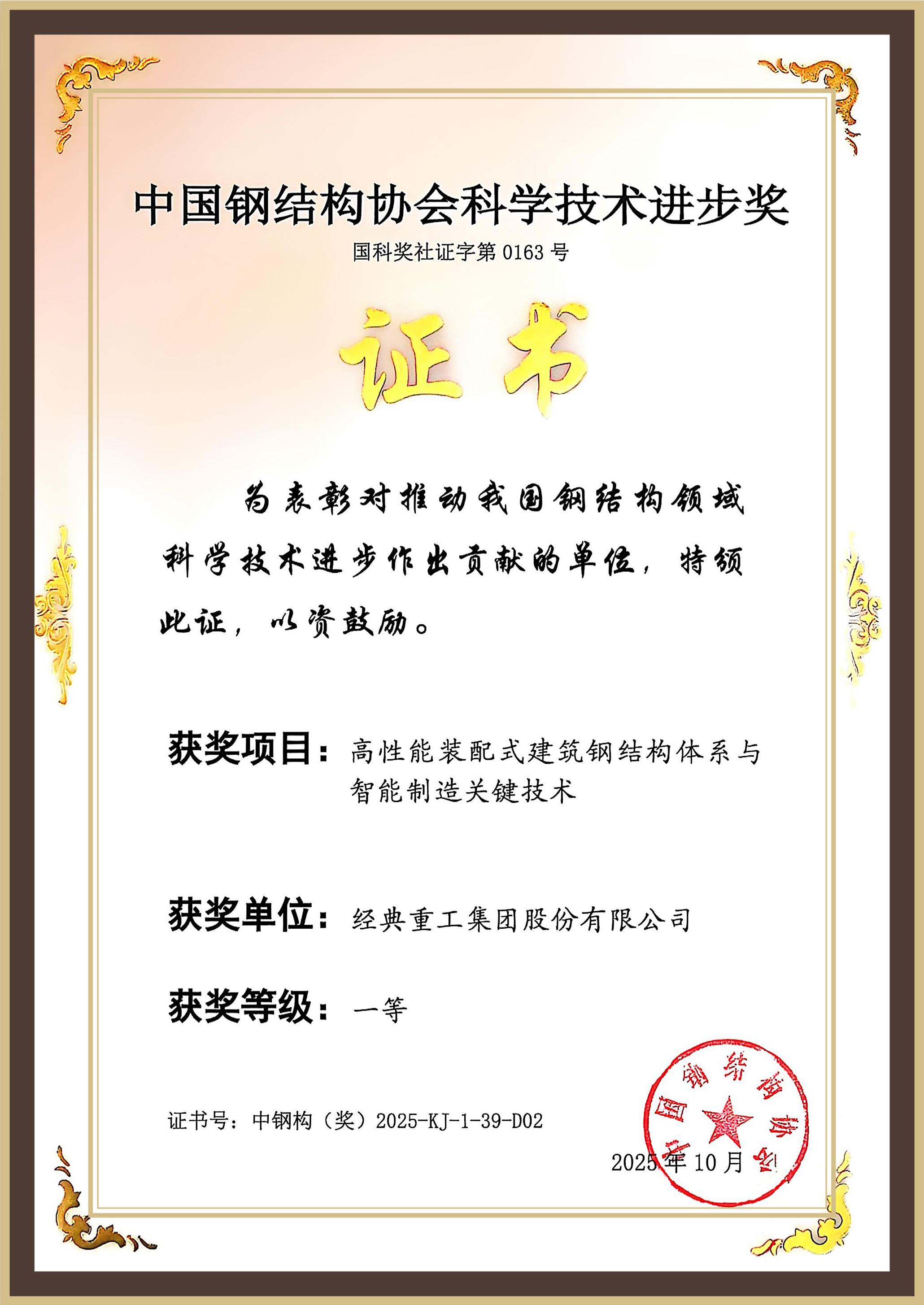 在科學(xué)技術(shù)獎頒獎典禮上,經(jīng)典重工集團股份有限公司作為主要科研單位參與的《高性能裝配式建筑鋼結(jié)構(gòu)體系與智能制造關(guān)鍵技術(shù)》項目榮獲中國鋼結(jié)構(gòu)協(xié)會科學(xué)技術(shù)進步獎一等獎。